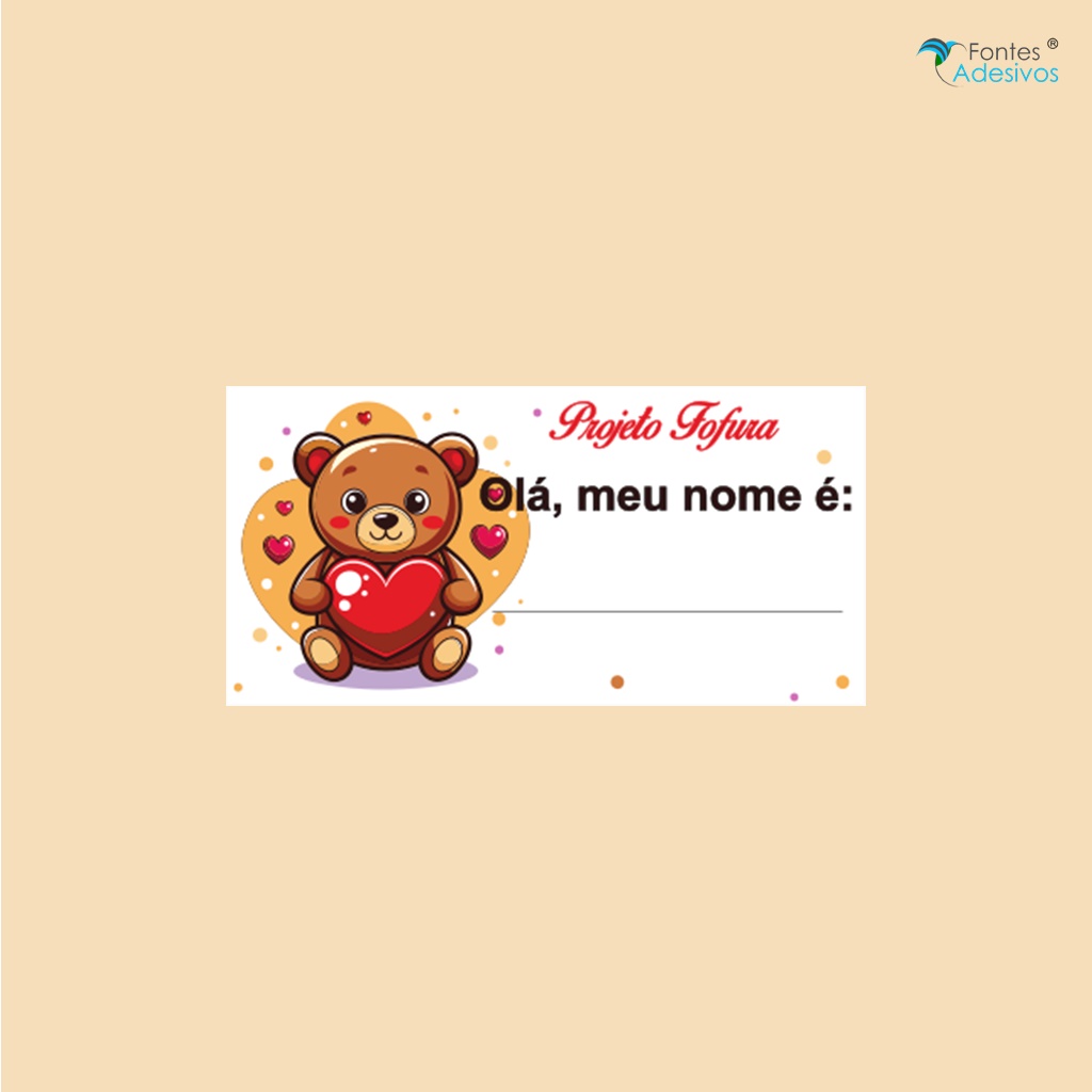 A etiqueta possui 50 mm de altura por 100 mm de largura, feita em papel sulfite colorido para frente. Não deve ser molhada para preservar a qualidade do adesivo e da impressão. Design com espaço para escrita do nome ou outra identificação.